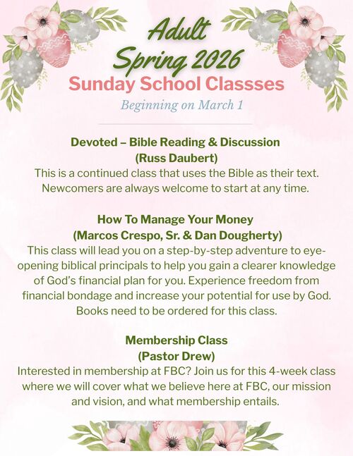 The Spring 2026 Adult Sunday School Quarter begins March 1. Descriptions for these courses can be found above.