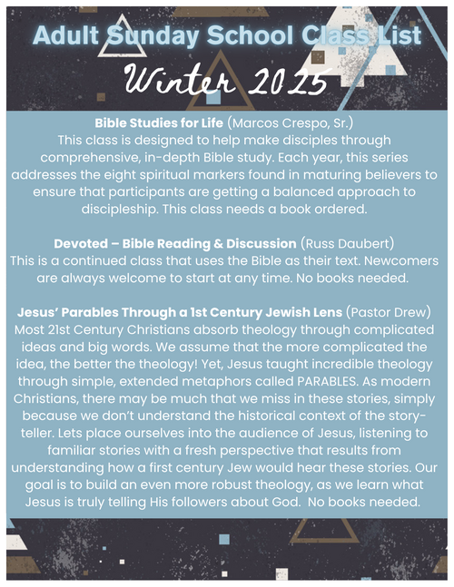 The Winter 2025/2026 Adult Sunday School Quarter begins December 7, 2025. Descriptions for these courses can be found above.